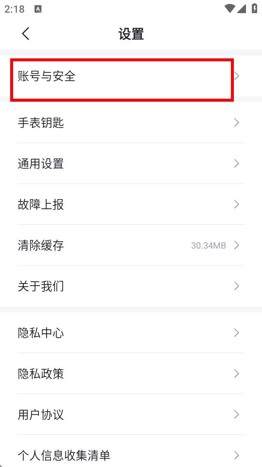 3、進入設(shè)置頁面后,點擊賬號與安全選項。