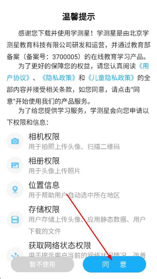 1、打開(kāi)學(xué)測(cè)星,在溫馨提示彈窗中點(diǎn)擊同意按鈕。