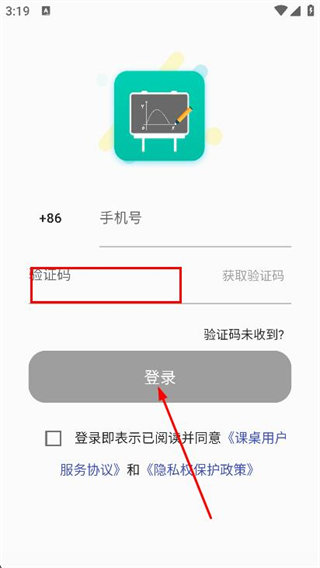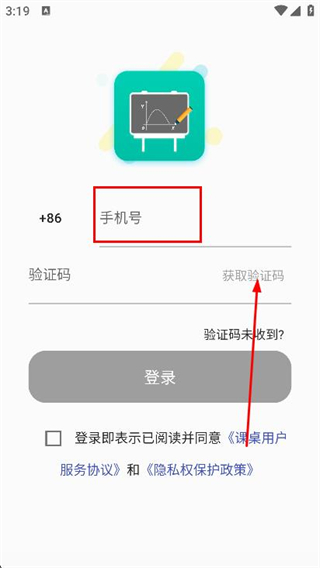 成功安裝移動端“課桌”后,打開 App,默認進入登錄頁面,輸入手機號獲取短信驗證碼,點擊“登錄”即可完成注冊登錄。