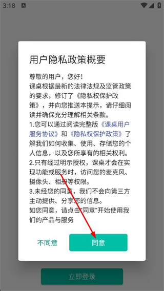 1、打開課桌APP,在用戶隱私政策概要彈窗中點擊同意。