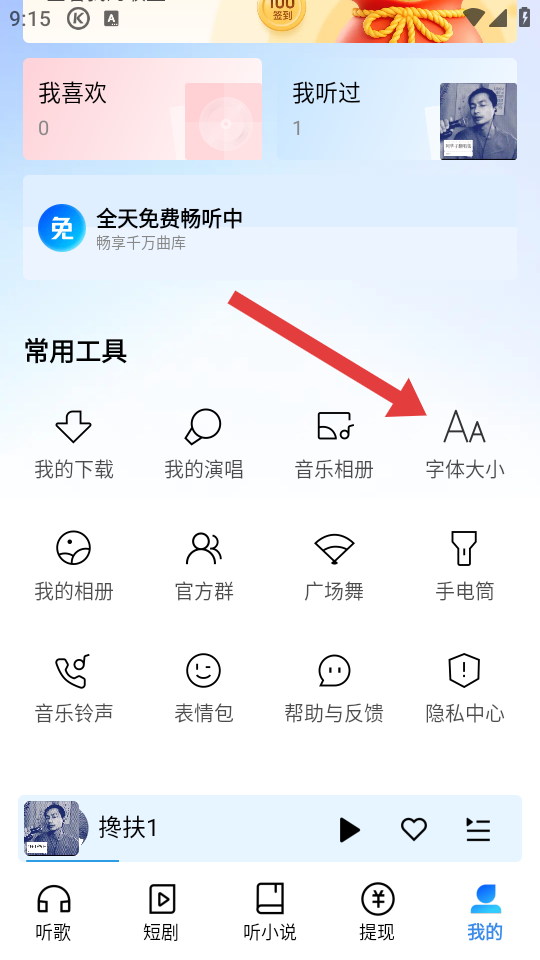 2、在個(gè)人頁面的常用工具區(qū)域,點(diǎn)擊字體大小,進(jìn)入字體大小選擇界面。