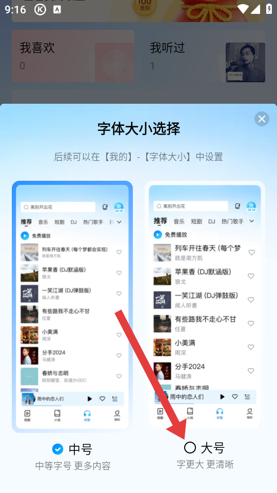 3、在字體大小選擇界面,可以選擇大號(hào)等字號(hào)選項(xiàng),選擇后即可調(diào)整APP內(nèi)的字體大小。
