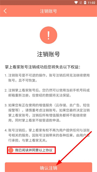 4、在注銷(xiāo)賬號(hào)頁(yè)面,勾選我已閱讀并同意以上協(xié)議后,點(diǎn)擊確認(rèn)注銷(xiāo)按鈕,完成賬號(hào)注銷(xiāo)操作。