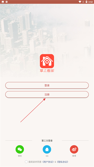 1、啟動(dòng)掌上看家的應(yīng)用,在首頁(yè)點(diǎn)擊注冊(cè)的按鈕。