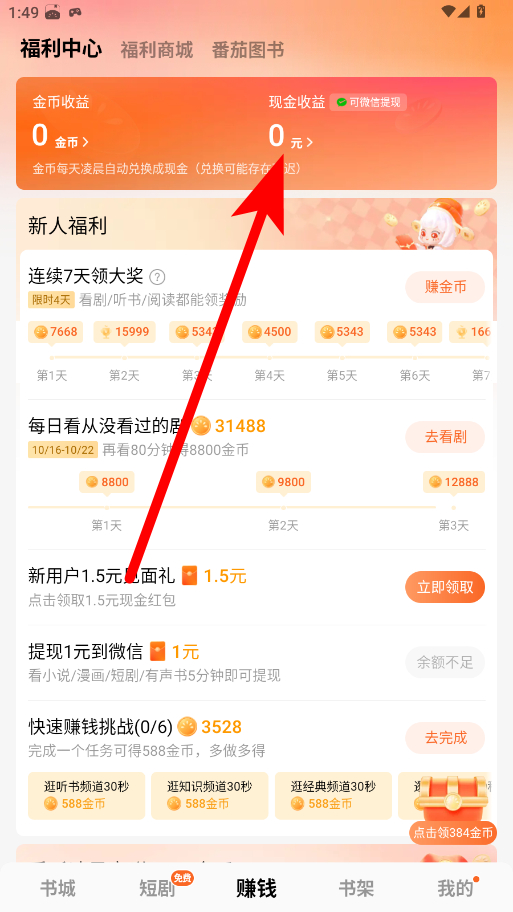 1、打開番茄免費(fèi)小說APP,點(diǎn)擊底部導(dǎo)航欄中的賺錢選項(xiàng),進(jìn)入福利中心頁面。