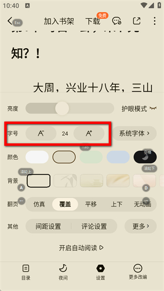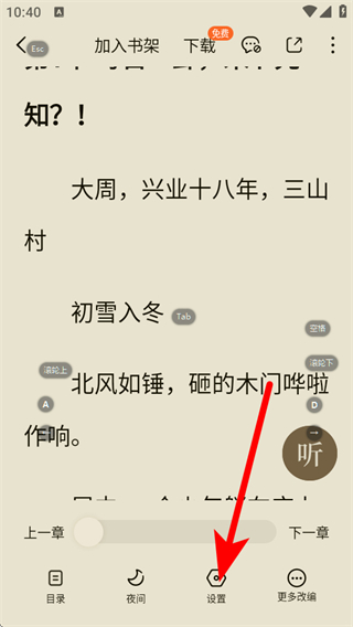 3、在小說閱讀界面,點(diǎn)擊下方設(shè)置選項(xiàng),進(jìn)入設(shè)置頁面。