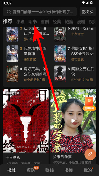 1、在番茄a(bǔ)pp書城頁面,點(diǎn)擊聽書選項(xiàng),進(jìn)入聽書作品列表頁面。