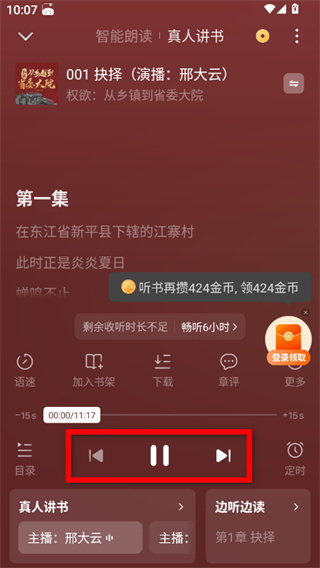 3、在聽書播放界面,可使用暫停、切換章節(jié)等功能,開始聽書體驗(yàn)。