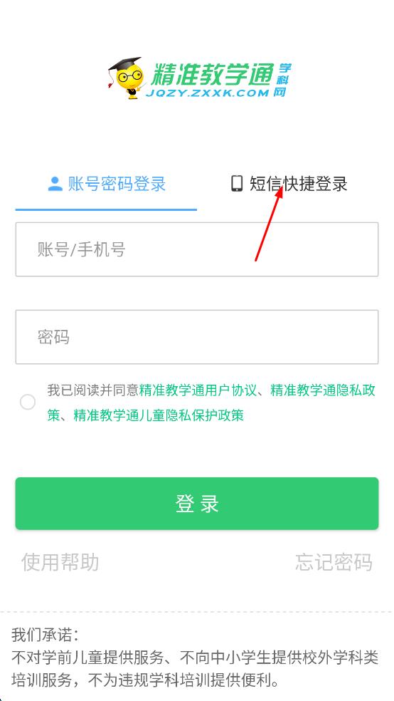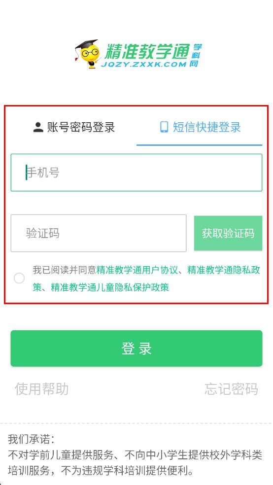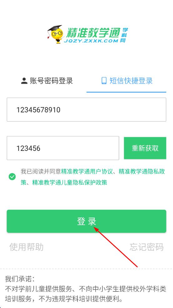 4、將收到的驗(yàn)證碼輸入到“驗(yàn)證碼”輸入框中,勾選“我已閱讀并同意精準(zhǔn)教學(xué)通用戶(hù)協(xié)議,最后點(diǎn)擊“登錄”按鈕,即可完成短信快捷登錄操作。