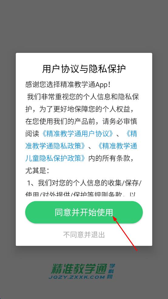 1、打開(kāi)精準(zhǔn)教學(xué)通app,在彈出的用戶(hù)協(xié)議與隱私保護(hù)界面,找到“同意并開(kāi)始使用”按鈕,點(diǎn)擊該按鈕。