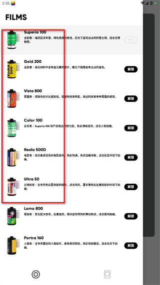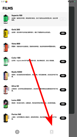 1、打開最后一卷膠片應(yīng)用,點(diǎn)擊左下角的膠卷圖標(biāo),選擇喜歡的膠片類型,如Superia 100。
