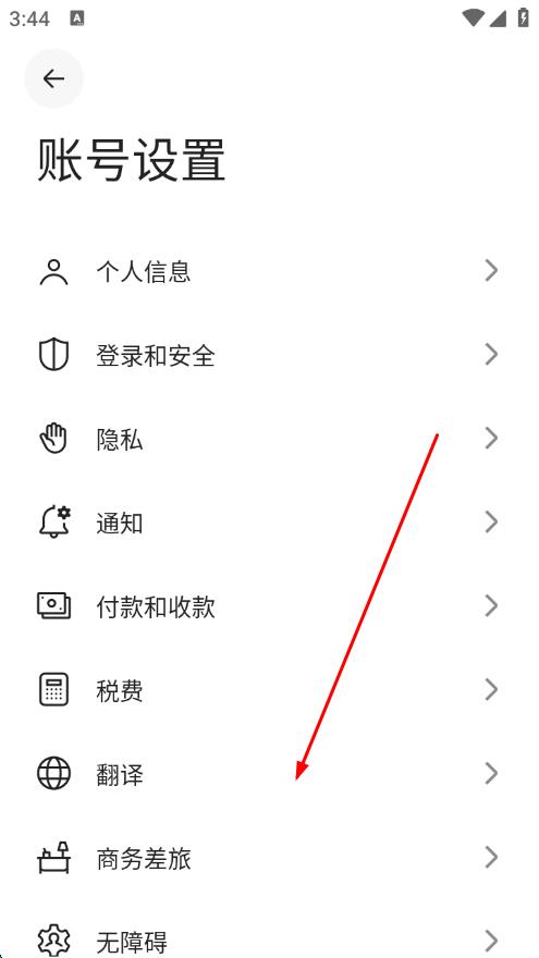 3、進(jìn)入賬號(hào)設(shè)置頁(yè)面后,向下滑動(dòng)找到并點(diǎn)擊翻譯選項(xiàng)。