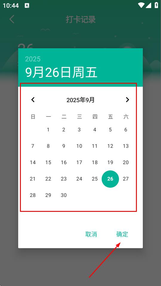 4、在彈出的日歷界面中,選擇具體日期,點(diǎn)擊確定,即可查看對(duì)應(yīng)日期的打卡記錄。