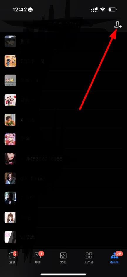 2、在通訊錄頁面,點(diǎn)擊右上角的+圖標(biāo)。