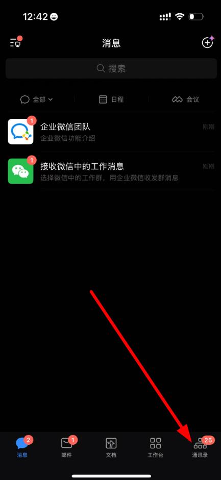 1、打開企業(yè)微信,進(jìn)入底部導(dǎo)航欄的通訊錄頁面。