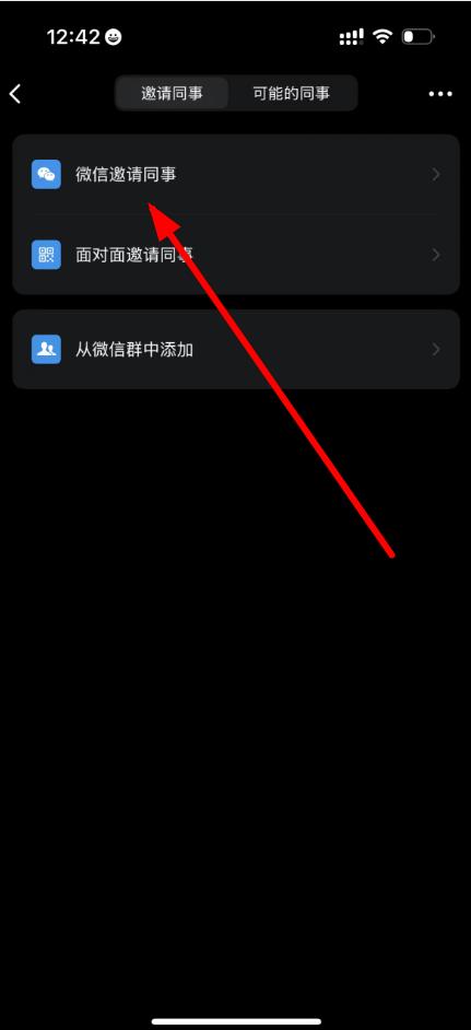 3、點(diǎn)擊+圖標(biāo)后在彈出的選項(xiàng)中,選擇微信邀請同事,按照后續(xù)提示操作即可邀請人進(jìn)群。