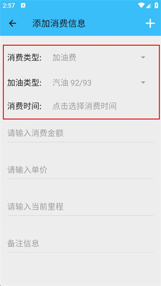 3、可以選擇消費(fèi)類型,輸入消費(fèi)金額、消費(fèi)時間、單價等信息。