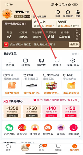 2、在登錄完成后點(diǎn)擊我的淘寶按鈕,進(jìn)入到個(gè)人中心,可以找到點(diǎn)擊待評(píng)價(jià)選項(xiàng),進(jìn)入查看評(píng)價(jià)。