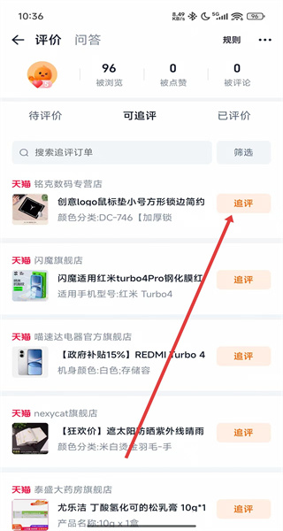 3、在進(jìn)入到評(píng)價(jià)管理頁面中,可以點(diǎn)擊下方商品右側(cè)的追評(píng)按鈕,進(jìn)行追加評(píng)論。