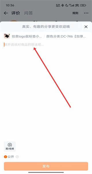 4、用戶可以點(diǎn)擊輸入框,輸入對(duì)商品的想法后點(diǎn)擊下方發(fā)布按鈕,即可完成追加評(píng)價(jià)。