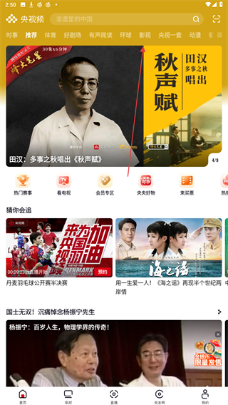 1、打開央視頻的APP,進(jìn)入時(shí)點(diǎn)擊右上的功能圖標(biāo)。