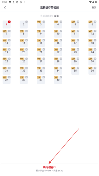 4、在選擇緩存視頻的頁面內(nèi),選擇集數(shù)后再點(diǎn)擊確定緩存即可。