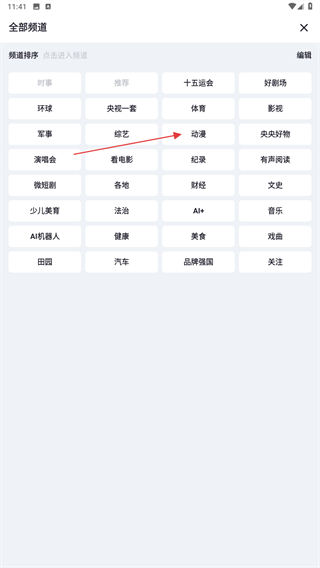 2、進(jìn)入全部頻道的頁面內(nèi),選擇并點(diǎn)擊動(dòng)漫。