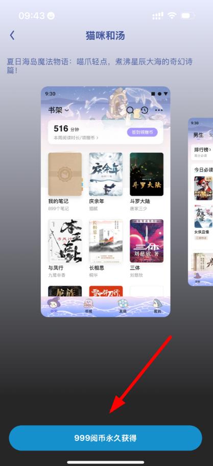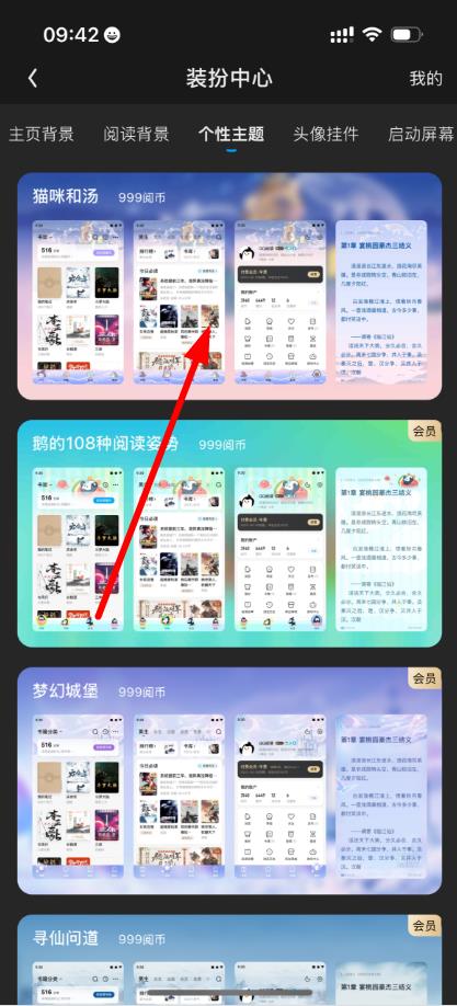 3、進入裝扮中心后可選擇主頁背景、閱讀背景等類別,如選擇“貓咪和湯”主題,再點擊下方按鈕,花費對應閱幣如999閱幣永久獲得該裝扮。