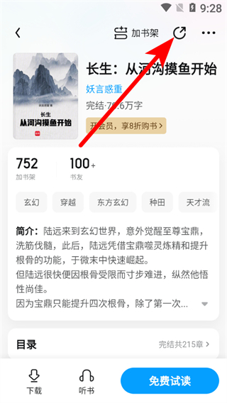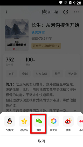 2、在書籍詳情頁面,點擊分享圖標,彈出分享選項列表。