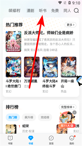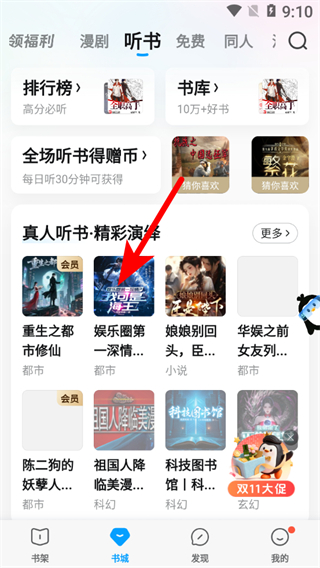 1、在QQ閱讀書城頁面,點擊聽書選項,進入聽書板塊。
