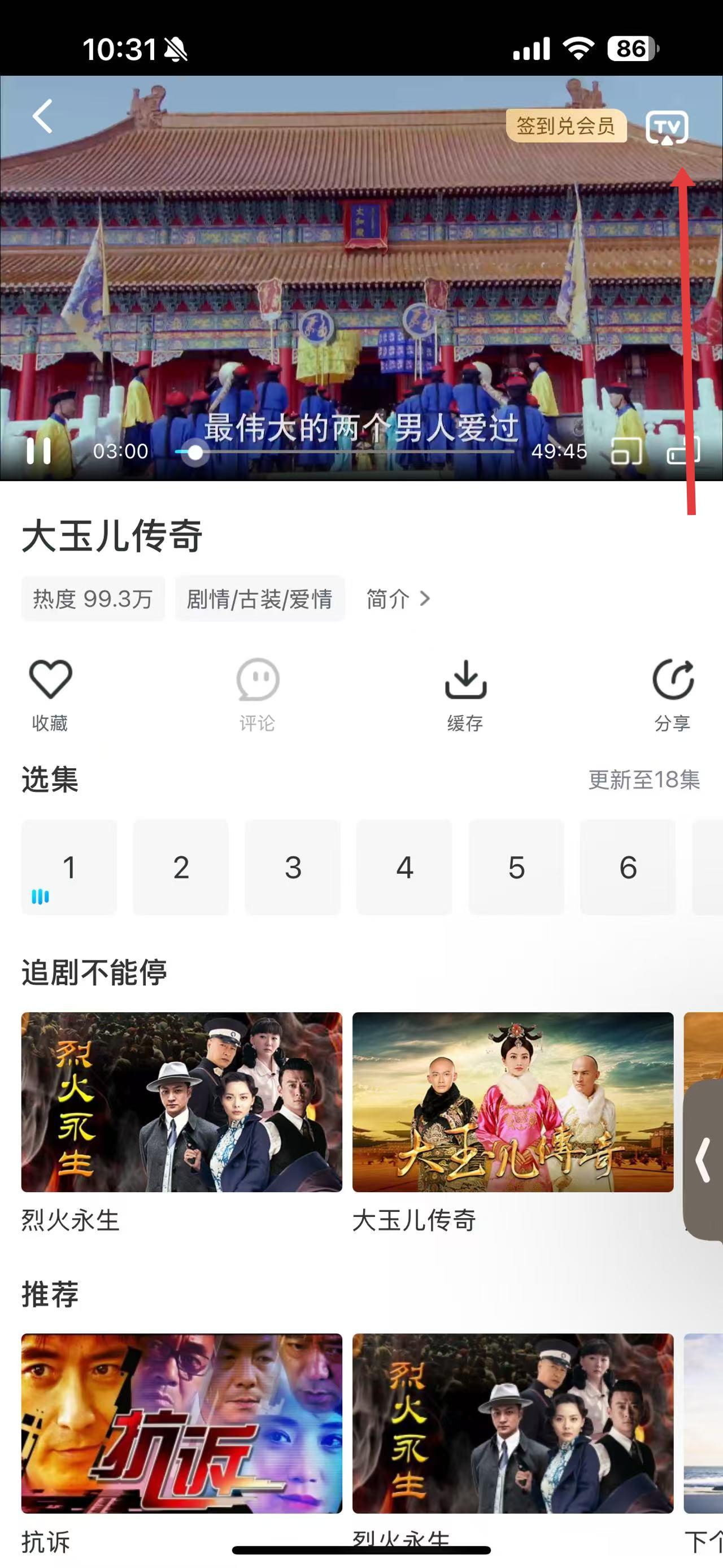 3、選擇好影視進入影片觀看,選擇上方TV按鍵。