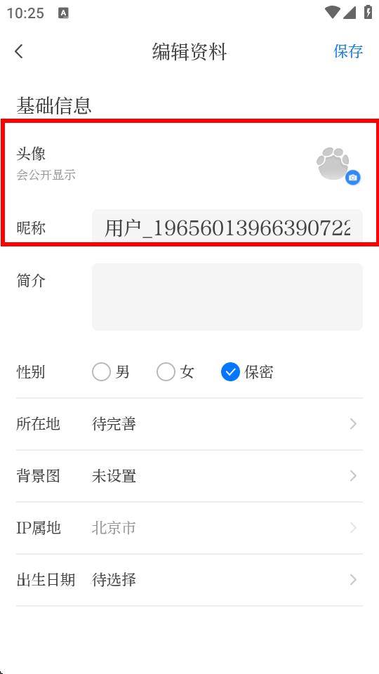 4、在編輯資料頁面,可點(diǎn)擊頭像區(qū)域更換頭像,也可點(diǎn)擊昵稱輸入框修改昵稱,修改完成后點(diǎn)擊右上角保存即可。