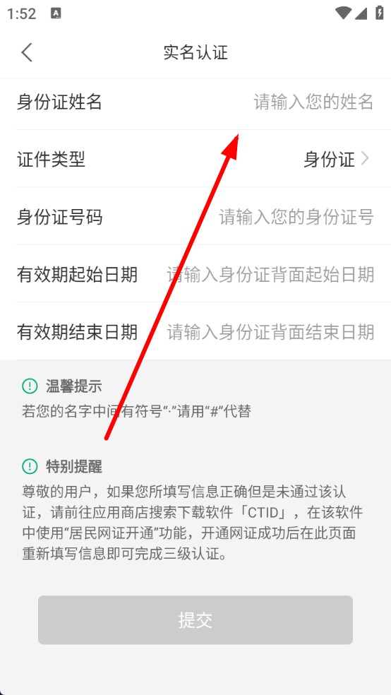 3、切換至實名認證頁,點擊標有身份證姓名提示的右側(cè)輸入框,填寫本人真實姓名,這是實名認證的基礎(chǔ)環(huán)節(jié),是確保身份信息真實有效。