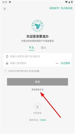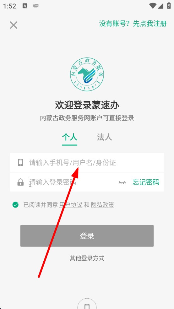 1、在蒙速辦登錄頁個人欄,點擊標有手機號、用戶名、身份證提示的輸入框,填寫登錄賬號,這是登錄系統(tǒng)的首要步驟。