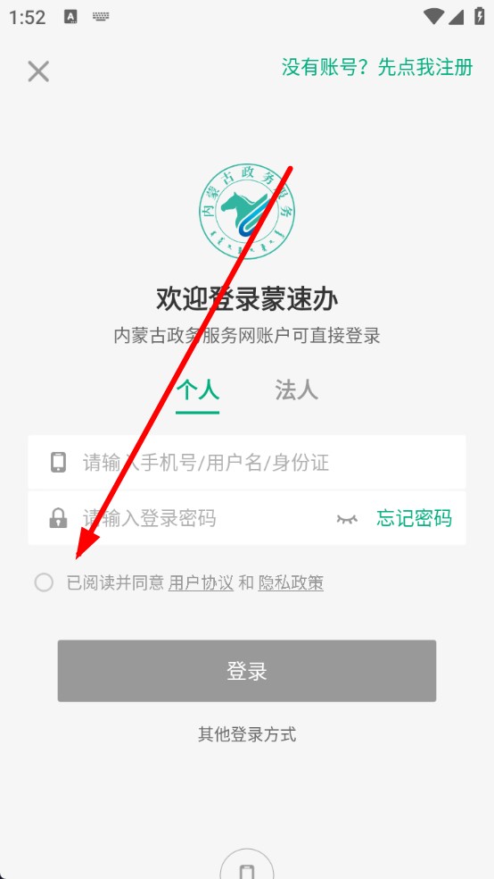 2、勾選登錄頁下方標有已閱讀并同意用戶協(xié)議和隱私政策的圓形選框,完成協(xié)議確認,這表明用戶認可平臺規(guī)則。