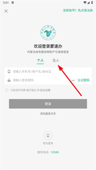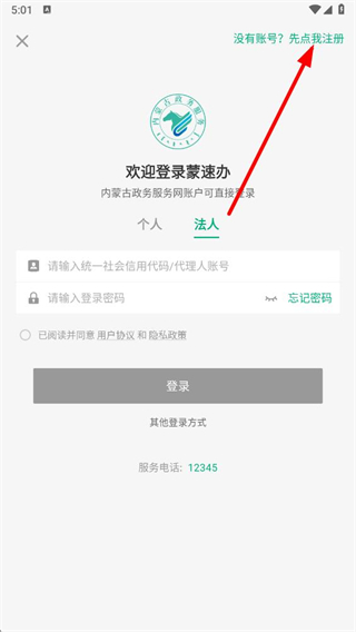 3、在法人登錄界面點擊沒有賬號先點我注冊選項,進入注冊頁面。