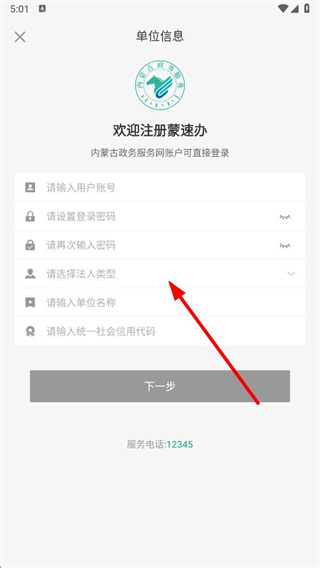 4、在頁面填寫用戶賬號、密碼、法人類型、單位名稱和社會信用代碼后點擊下一步,按提示完成法人賬號注冊操作。