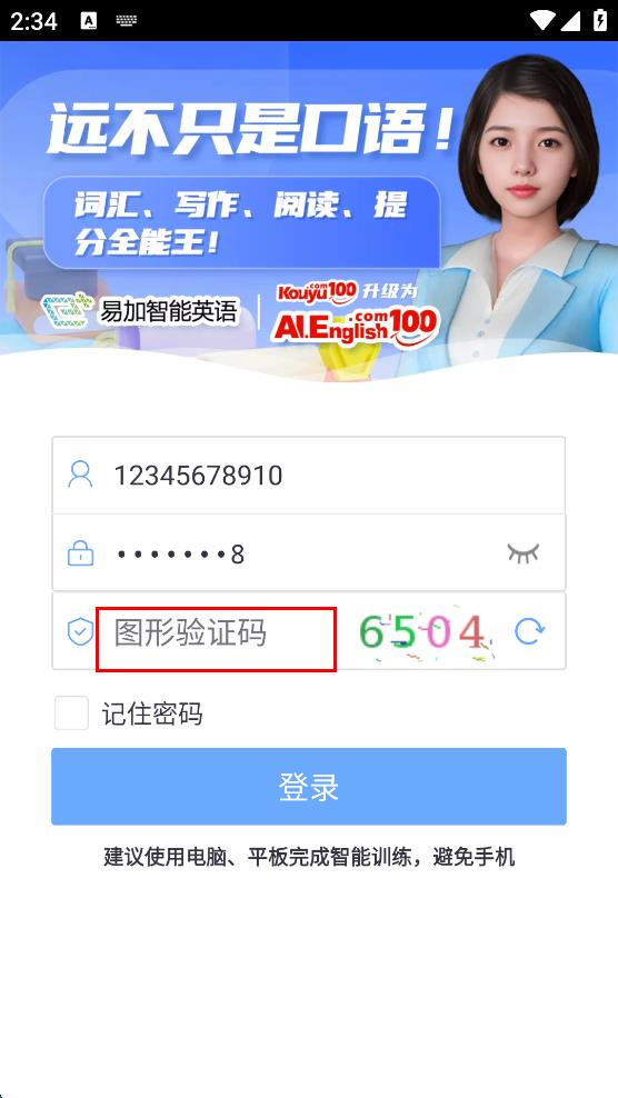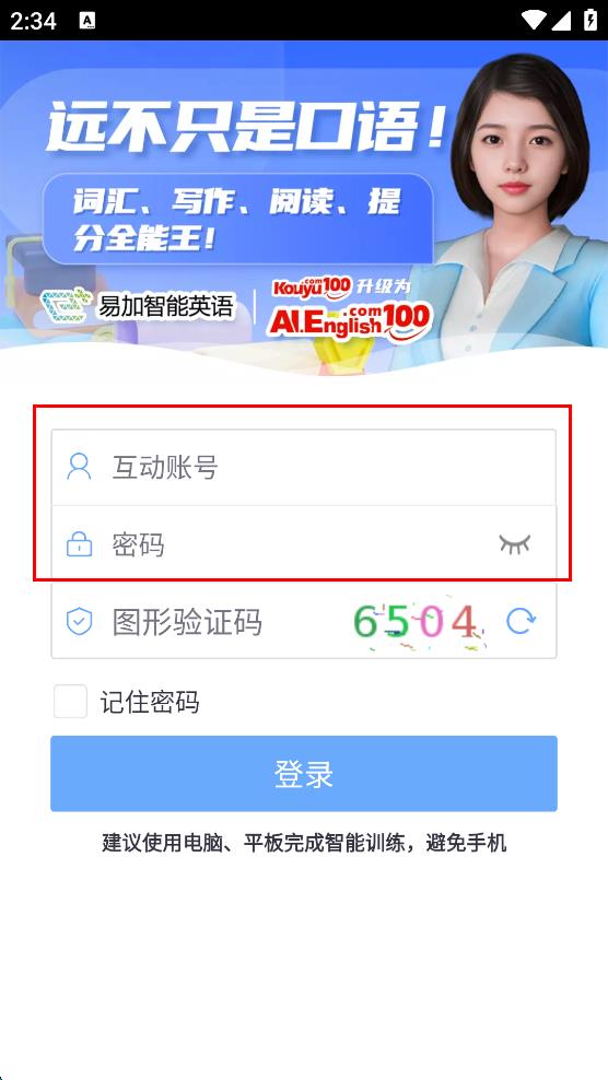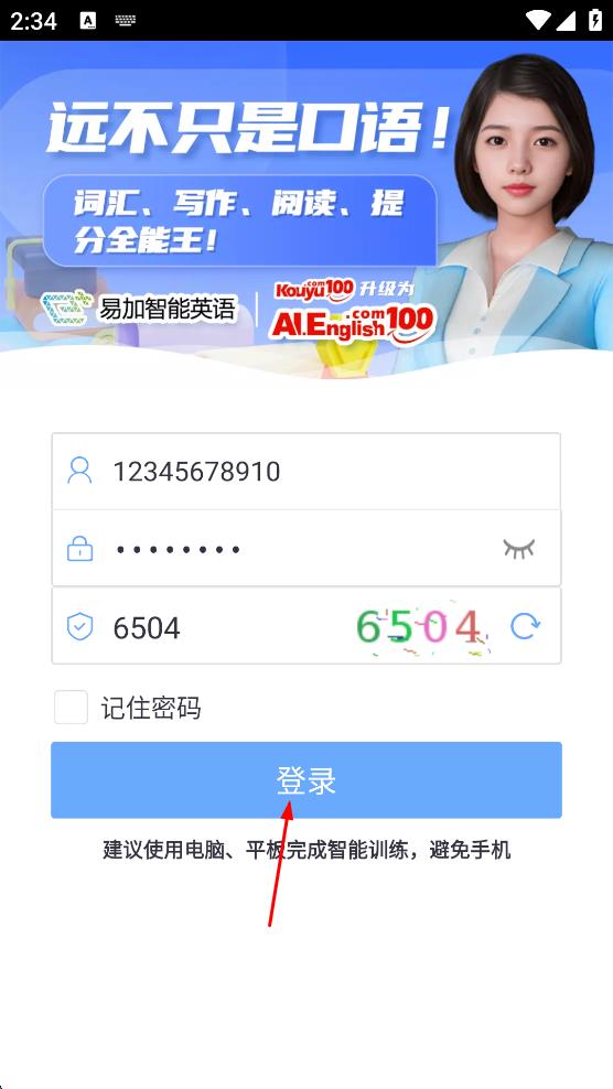 4、若需要下次快速登錄,可勾選“記住密碼”,最后點(diǎn)擊“登錄”,即可完成易加智能英語(yǔ)的登錄。