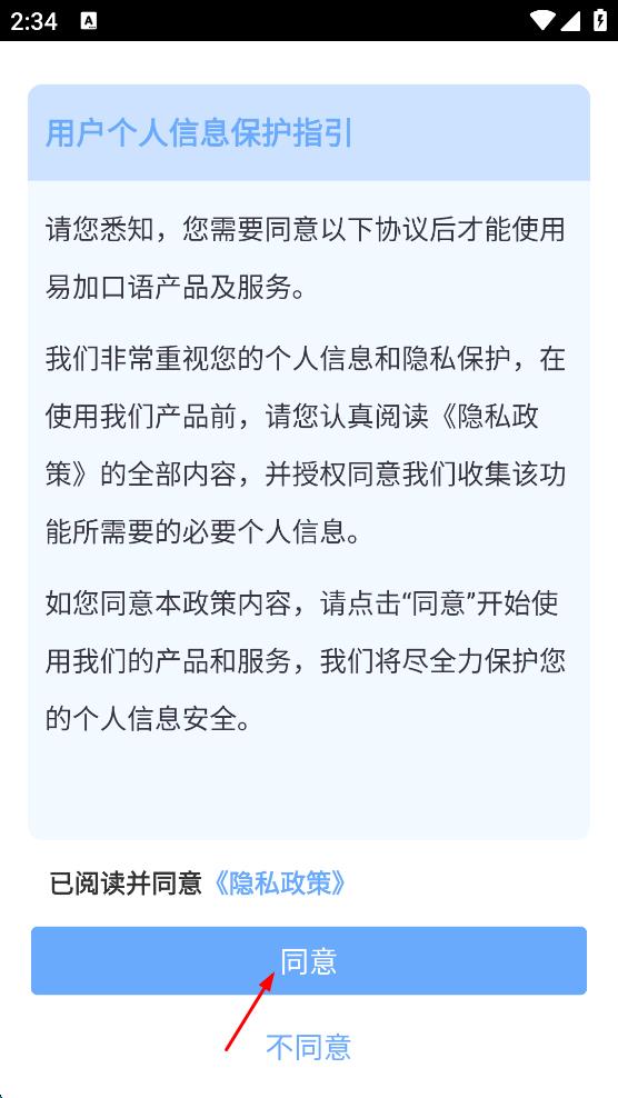 1、打開(kāi)易加智能英語(yǔ),在彈出的用戶個(gè)人信息保護(hù)指引提示框中,點(diǎn)擊“同意”,進(jìn)入登錄頁(yè)面。