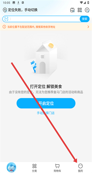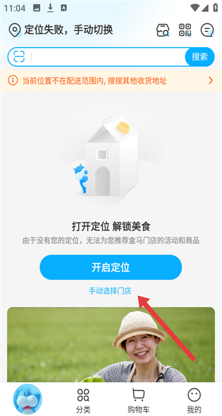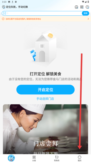 2、在進入到盒馬首頁中,若定位失敗可以點擊手動選擇門店按鈕,進行定位。