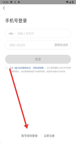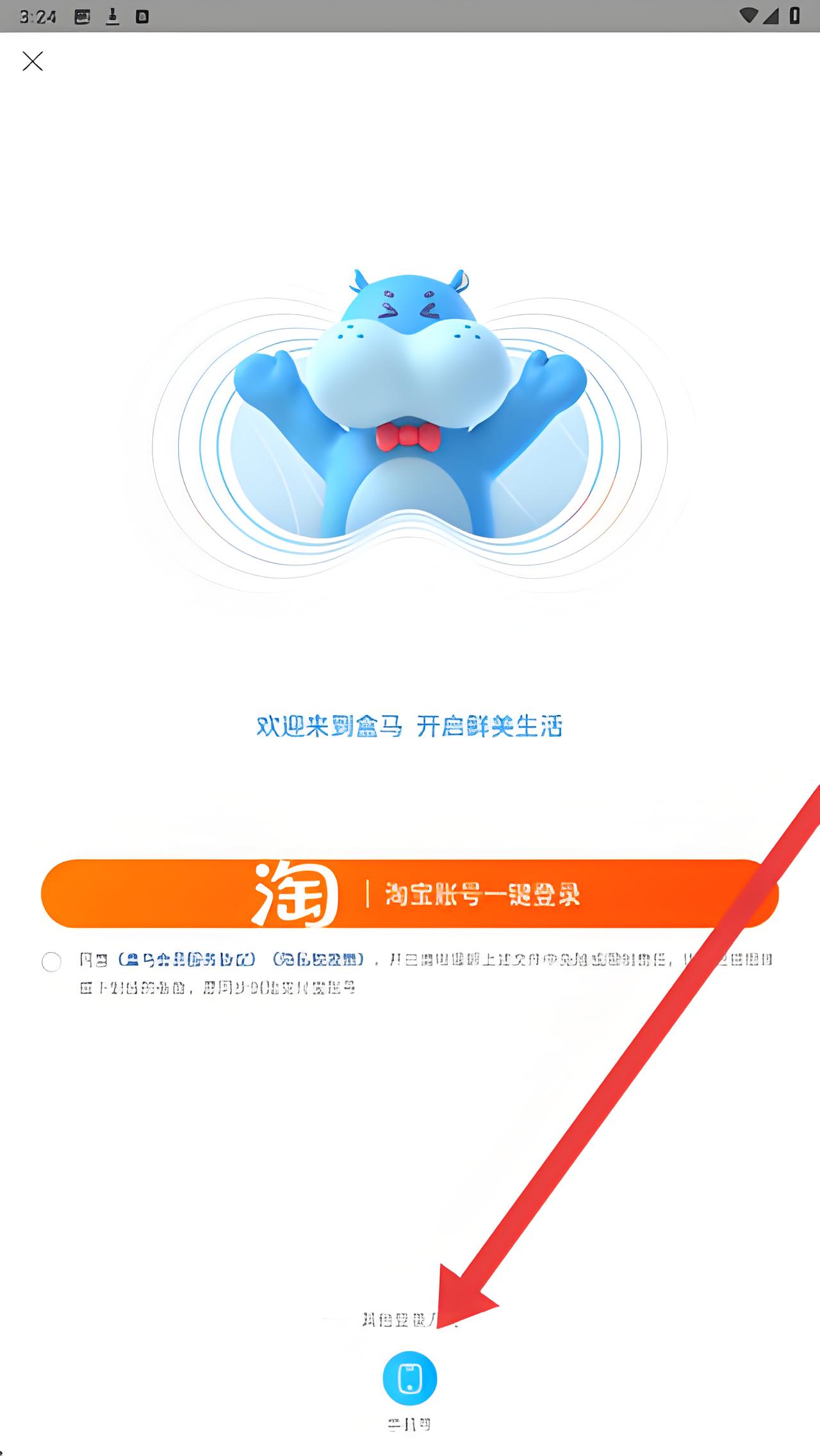 2、在盒馬登錄界面,按照指示通過點擊下方手機號登錄的圖標,切換至手機號登錄頁面。