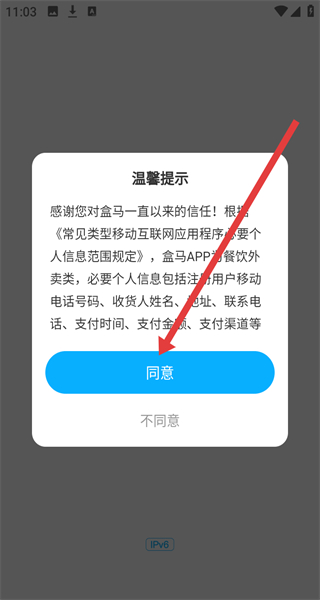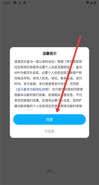 1、打開盒馬APP,彈出溫馨提示窗口,點擊同意后開始使用。