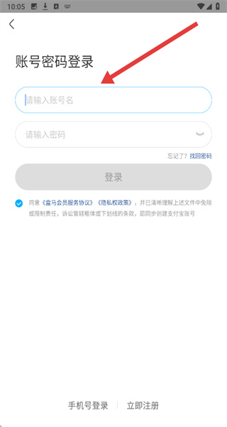 4、在賬號密碼登錄頁面,依次填寫賬號名和登錄后密碼,點擊登錄按鈕,完成盒馬APP的登錄流程。