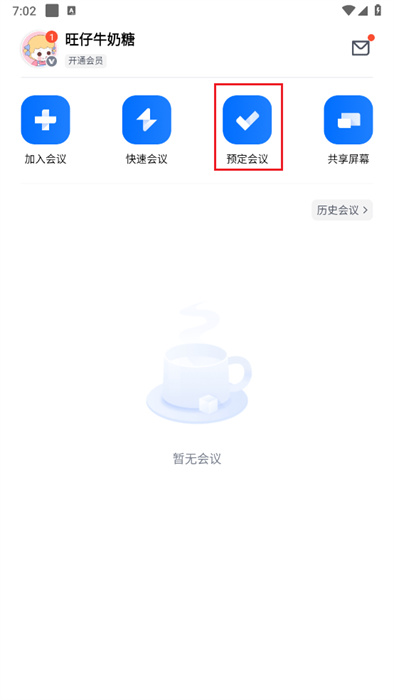 1、進(jìn)入應(yīng)用之后,需要點(diǎn)擊【預(yù)定會(huì)議】按鈕,以進(jìn)行預(yù)定會(huì)議界面的進(jìn)入;