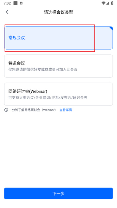 2、此時(shí)將會(huì)有三種不同的會(huì)議可以選擇,可以點(diǎn)擊你想要進(jìn)行的會(huì)議類型,如以【常規(guī)會(huì)議】為例;