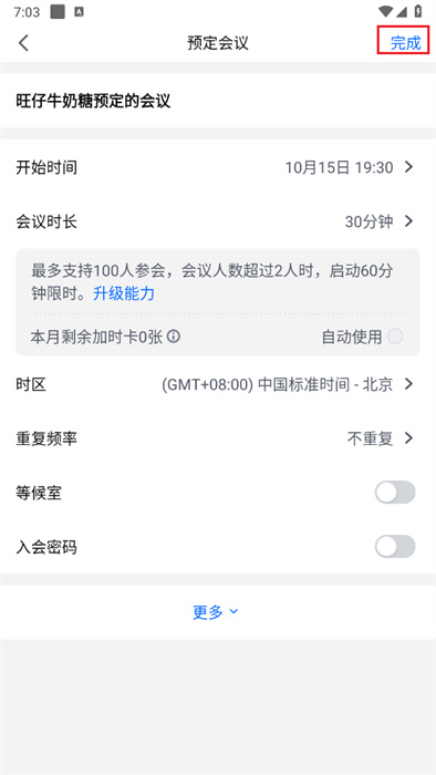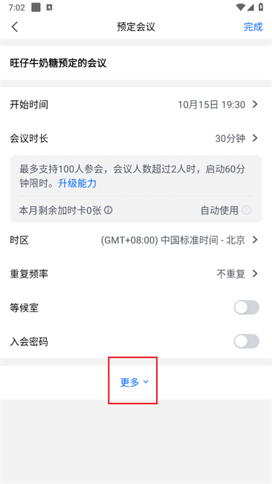 3、可以在常規(guī)會(huì)議欄進(jìn)行各項(xiàng)不同信息的選擇,還可以點(diǎn)擊【更多】按鈕,來(lái)進(jìn)一步的完善會(huì)議的規(guī)則要求;