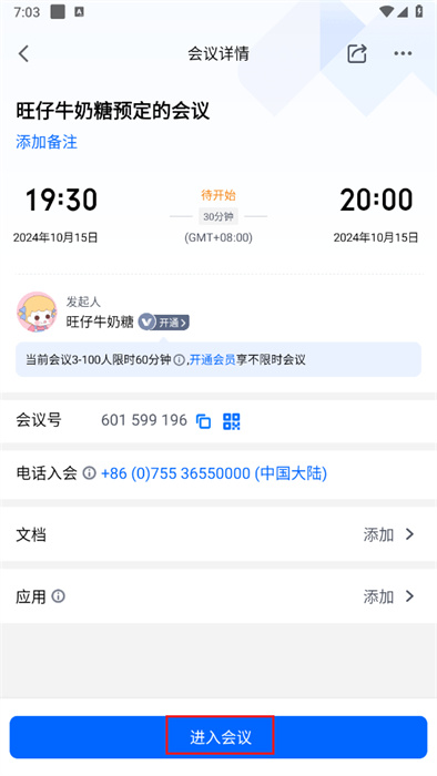 6、最后只需要在會(huì)議的時(shí)間點(diǎn)擊【進(jìn)入會(huì)議】按鈕,即可開(kāi)啟會(huì)議。