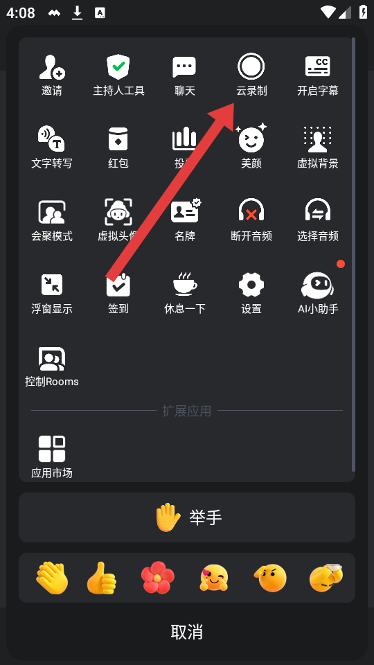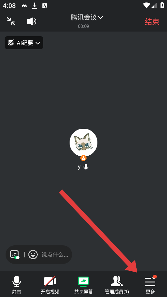 2、進(jìn)入會(huì)議界面后,點(diǎn)擊底部工具欄的更多,展開(kāi)功能菜單,查看是否顯示云錄制或本地錄制選項(xiàng)。