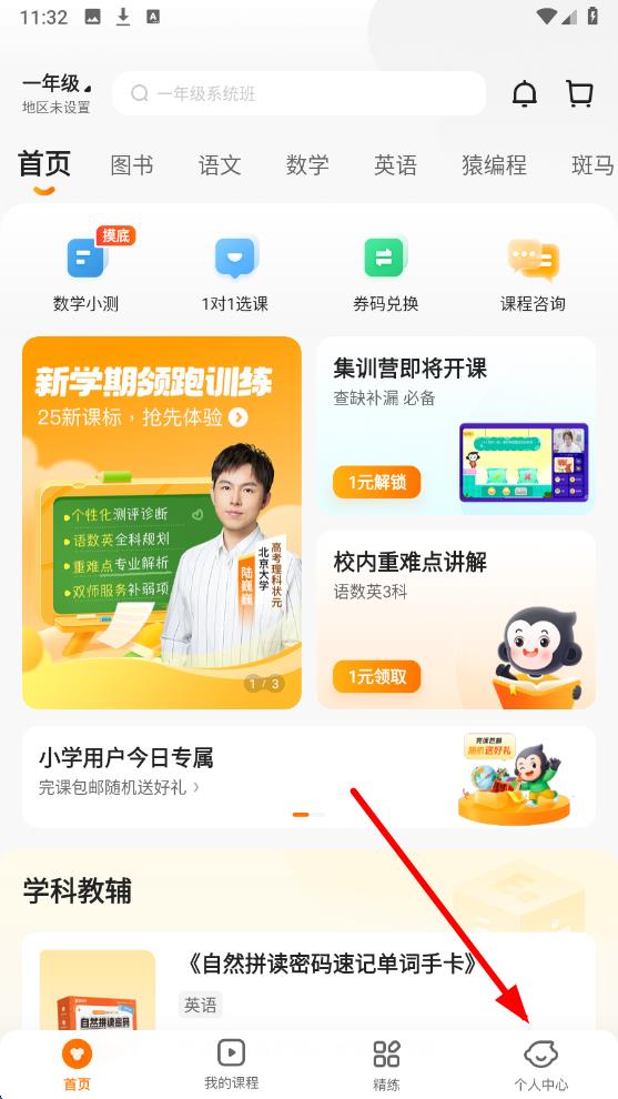 1、打開猿輔導(dǎo)應(yīng)用,點(diǎn)擊底部導(dǎo)航欄中的個(gè)人中心選項(xiàng),進(jìn)入個(gè)人中心頁(yè)面。