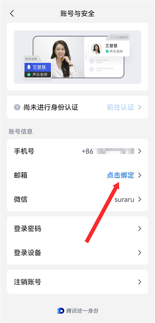 3、在賬號(hào)與安全的頁面,需要點(diǎn)擊郵箱右側(cè)的點(diǎn)擊綁定。